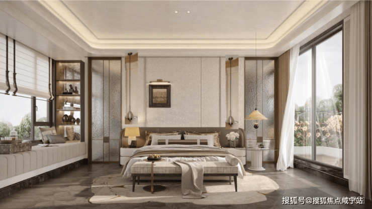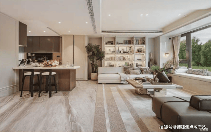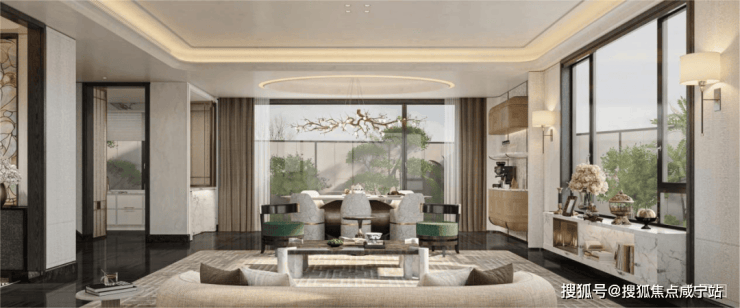 保利·西郊和煦售楼处电话☎:400-8787-740✔✔客餐厅、南向次卧、独立主卧层层配享同等尺度面宽,充分将全天日照最大限度地纳入室内。巨幅落地玻璃窗如同取景框,将庭院绿意无缝衔接入内,最大化确保了每位家庭成员都能平等地享有阳光与观景的权利。