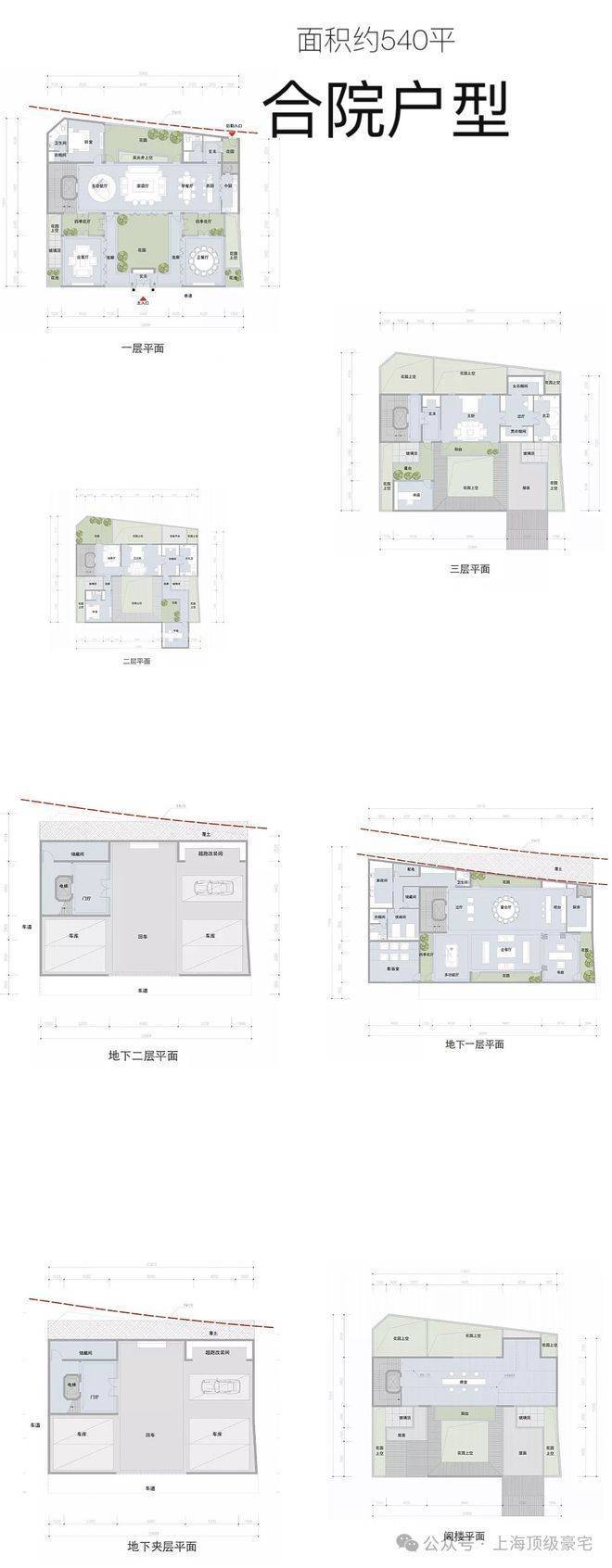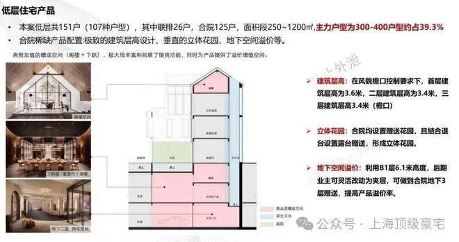 上海壹号院风貌别墅【体量】151套风貌【本批次】第一批次,38套,分3个组团【类型】纯合院风貌(毛坯交付)【面积】250平-900平(主力户型350--600)【均价】30万+,套均过亿【户型】每套不同,107个户型(1字型、回字形、C字形、L型、H型……)【风格】江南园邸、现代主义、街店式、近代装饰……多类型供选择【层高】3.9/3.6/3.6(大户型为主) 3.6/3.3/3.3(小户型为主)【赠送】花园、阳台、双露台、大面积地下室、阁楼闷顶高度不一【巷道】组团,支巷道3米-4.5米【物业】融创(暂定地上19.8元,地下10元,会所额外收费)【交房时间】预计2027年12月上海壹号院的风貌,根据目前仅有的资料,改良了很多:1. 分支巷道拓宽至3-4米,诸多项目还停留在1-2米;2. 阳台和露台用格栅确保私密性和开阔性,防止对视;3. 立体住宅,分层内嵌,采光差的首次开创房子内部做天井,确保全户型全明、每个角落有光4. 上海风貌层高最高的产品,很多户型层高:地下6.1米,一层3.9米,二层3.6米,三层3.6米5. 外小内大,保护大户型隐私和品质;6. 很多户型双露台,大户型2-4个花园7. 壹号院一贯作风,外部点状承重,设计多样性1) 层高惊艳,上海风貌目前基本都是3.6/3.3/3.3(当然壹号院也有部分是这种层高的),壹号院风貌面积大一点很多都是3.9米的层高,3.9/3.6/3.6,这个配置目前属顶配,地下室也是挑高6.1米,整体空间感尺度不错的;2) 天井设计,这是上海风貌的首次尝试,部分户型为了达到每一层、每个功能间有好的光线,在整个房子内部,做个采光天井,虽然没看到实地,但还是震撼到了我;3) 巷道不错,分支巷道能做到3-4.5米,间距可以的。