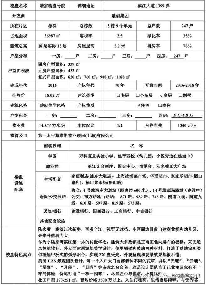 小区完全人车分流,车位比达到1:2,非常充足。楼栋内部为2梯2户或3梯2户,层高3.15米。陆家嘴壹号院内有1800平私家会所,含恒温泳池、健身房、儿童房。物业是五大行的第一太平戴维斯,14.8元/月/平标准收费。