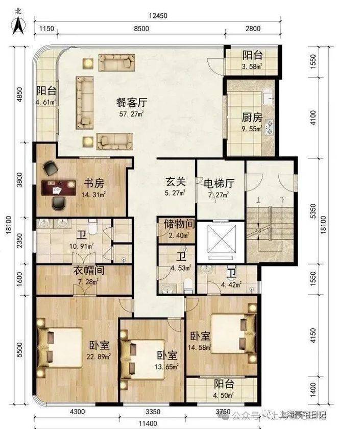 陆家嘴壹号院的得房率比较高达到80%。主力户型是171平三房和196-252平四房。为了看北面的江景,皆为南卧室北厅的设计,面宽较宽,户型很不错。