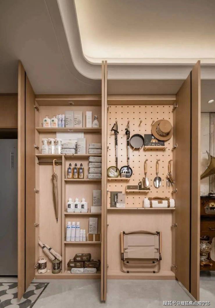 双薄柜设计则大大增加容纳空间,举例来讲,可容纳约200包纸巾,足以满足全家1年使用。而洞洞板设计,则可收纳清洁工具、长柄伞等大件日常用品,如此贴心布局,保证室内物品足够井然有序,也更为利于家庭日常打扫。