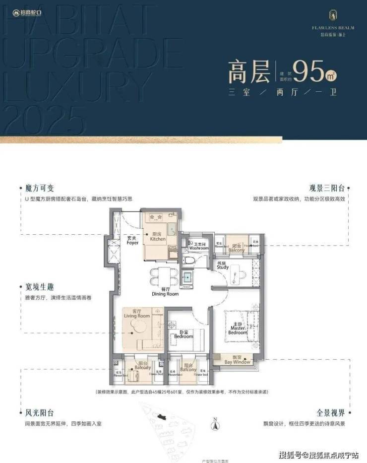 建筑面积约95/105㎡三房,进阶改善绝版“三阳台”户型
