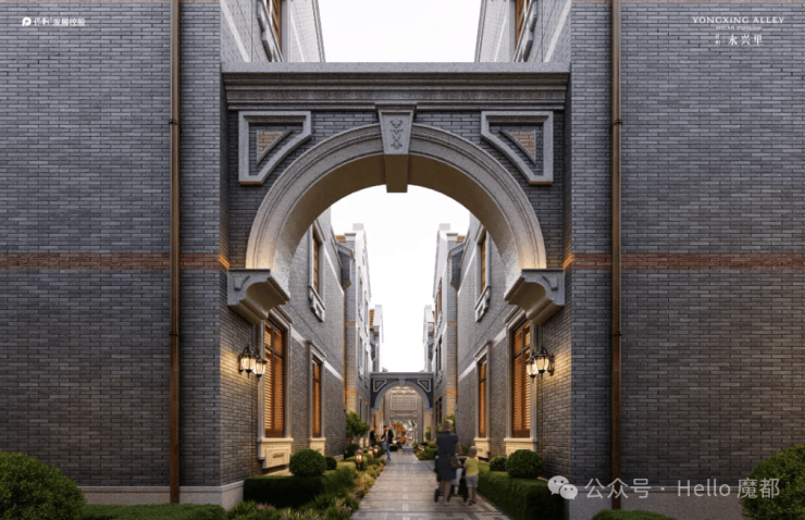 复刻海派里弄格局,融合骑楼、拱形门坊、红砖清水墙等元素,赓续衡复风貌区的历史文脉;