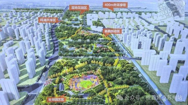 整座公园(在建中)划分为:湿地花园区、鸣湖共享区、林荫跃动区和社邻园艺区,四大功能分区。