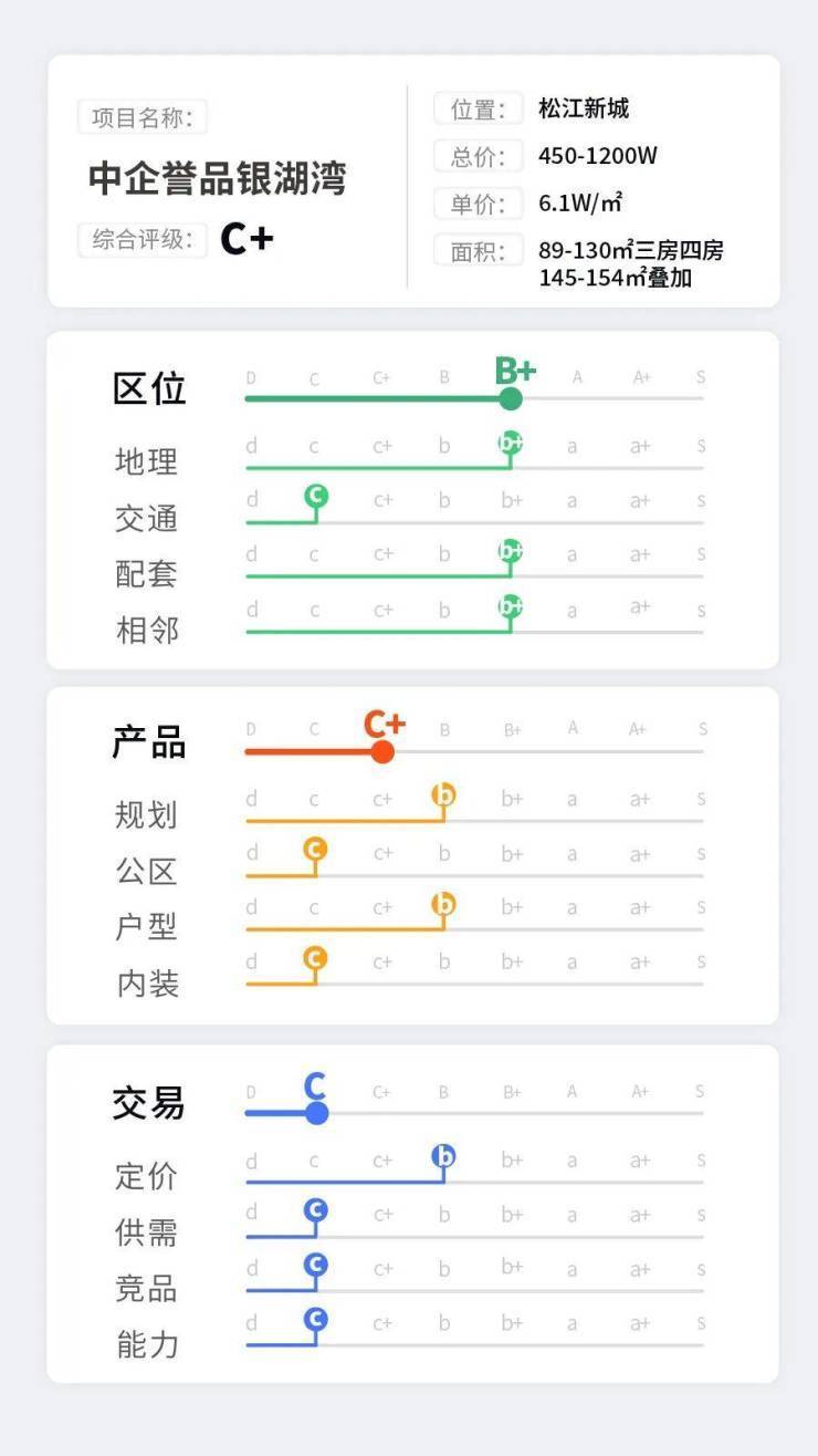 产品评级C+,其中规划 b、公区c、户型b、装修c。