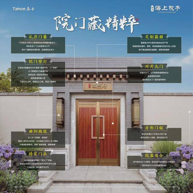 【泰禾·海上院子售楼处电话:400-9966-940☎️☎️☑️☑️【官网】✅✅✅】一脉相承泰禾院子系精髓,将传统文化及中式美学融入产品,提炼出中式元素围合布局、建筑细节等,以“照壁、抱鼓石、浮雕、铜质方灯、院门、门钹、平枋、匾额”国宅门第八大体系,以名师巧匠精心雕琢,无一处不让居住尊崇倍生。