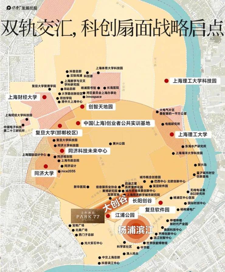 保利·外滩启PARK77售楼处电话:400 - 1010 - 064☑️☑️最新发布的科创扇面,以5公里的创新半径,在杨浦滨江南段徐徐展开以江浦公园为支点,将“扇面”展开,上海最密集的高校智力资源汇聚于此北望4公里,百年复旦;向西3公里,同济巍然;东南5公里,上海理工;聚合高端人才、链动产城资源,创新杨浦