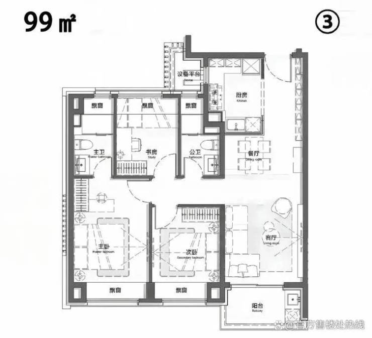 建面约 97㎡经典户型:该户型方正,空间利用率极高。南北通透的设计,让清风与阳光肆意穿梭于每一个房间。客厅宽敞明亮,连接着景观阳台,既能在此与家人欢聚,又能欣赏窗外的美景。餐厅与厨房紧密相连,烹饪就餐一气呵成。三间卧室布局合理,动静分区,保证了休息空间的静谧。主卧套房设计,带有独立卫生间和衣帽间,给予主人私密舒适的居住体验。