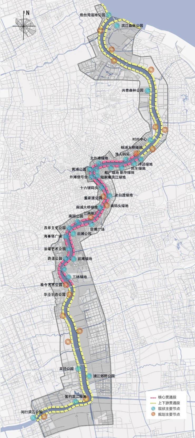 在《黄浦江沿岸发展建设规划(2018-2035)》有明确的规划范围定义:即杨浦大桥至徐浦大桥,总计45公里的两岸岸线,目前已经贯通。