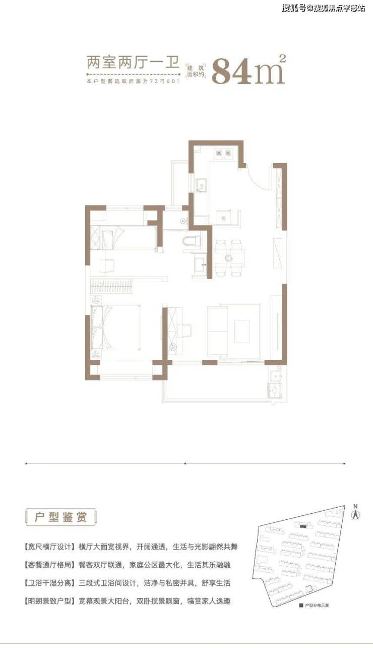 建面约84㎡2房2厅1卫户型,做到了2+1开间朝南+动静分离+卫生间干湿分离,非常紧凑的2房户型。
