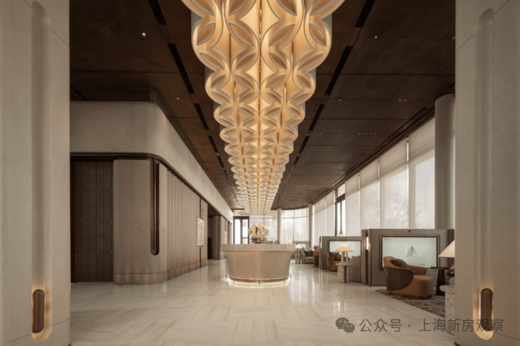 项目归家门庭采用石材,叠加铝板元素,构建出极具质感的空间和松弛氛围,令张江的归家仪式感焕然一新。