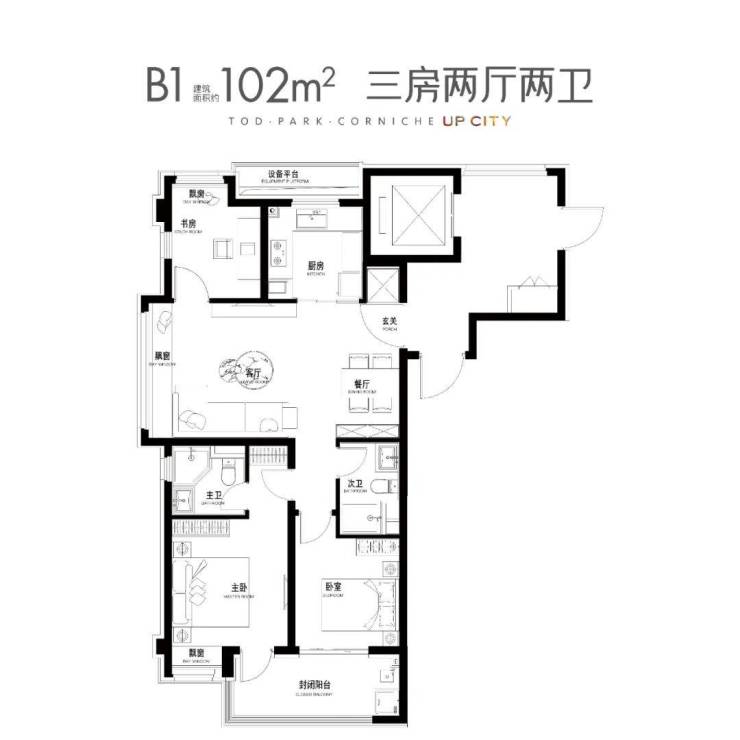 建面约103㎡3房2厅2卫▼
