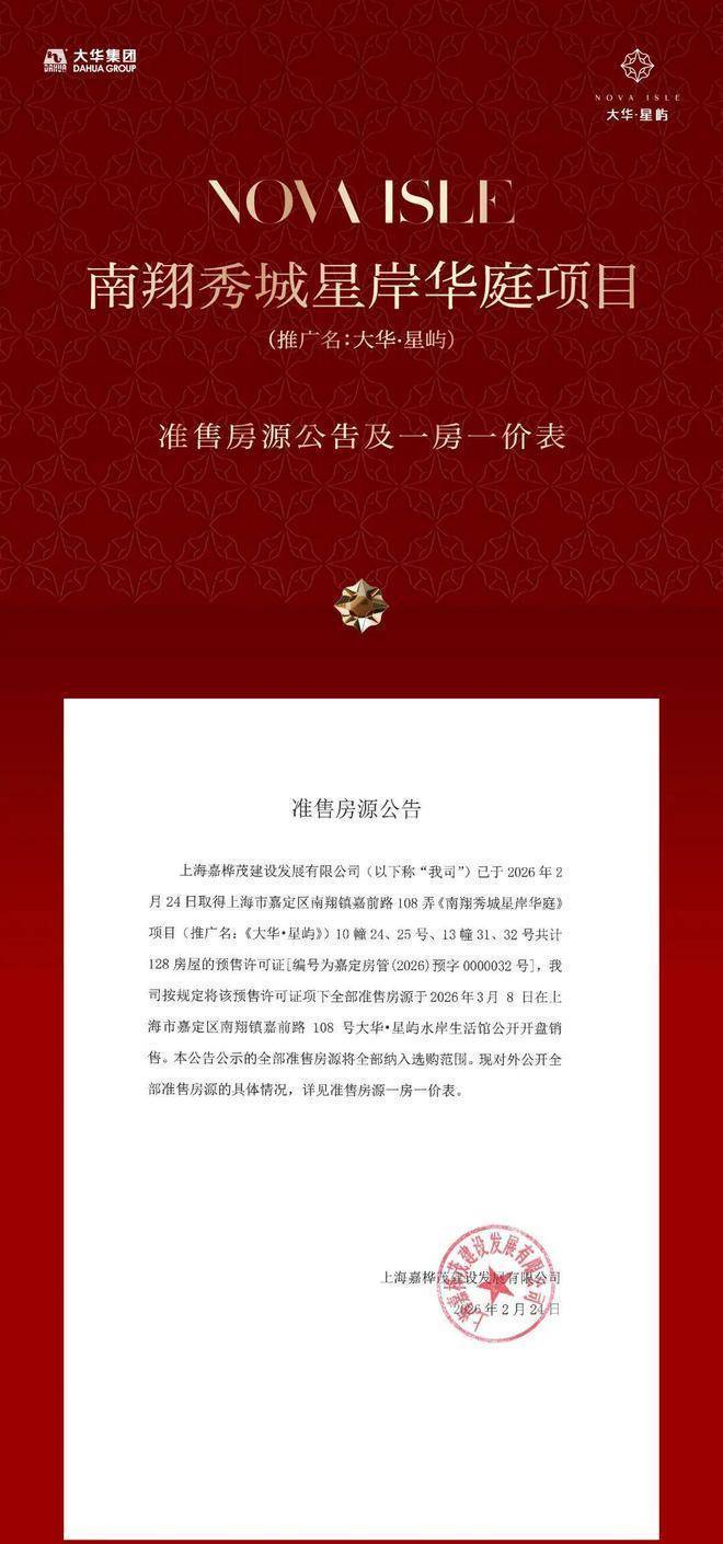 嘉定南翔低密水岸墅区「大华星屿」二批次2月26日认购,建面约107-123㎡3-4房,过会均价55529元/㎡!