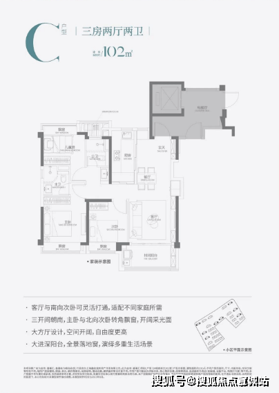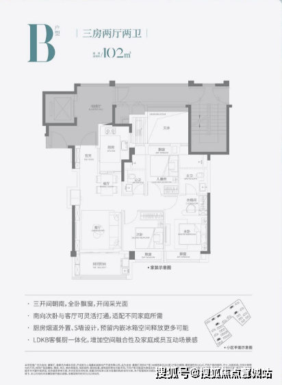 三开间朝南。拥有充分的采光。主卧及北卧室还带有L型飘窗,大进深阳台全景落地窗,优化采光,提升观景体验。
