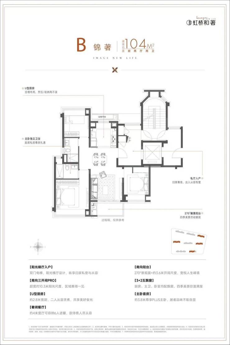 建面约104㎡3房,在建面94㎡小3房优点上,又进一步升级了尺度感,约10.3m的南向面宽,为室内带来了出众的采光面和尺度感,这个户型无论从实用性、尺度感,亦或是视野、采光、私密性来说,都做得相当优秀。
