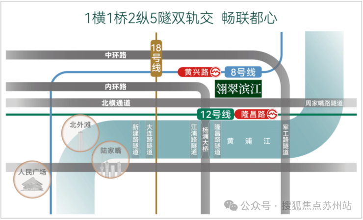 北横通道黄金十字:沿上海第二条东西动脉(入口直线约350米),形成“虹桥-苏河湾-北外滩-杨浦滨江”城市发展轴,约12分钟接驳北外滩、约15分钟直抵陆家嘴,同步串联瑞虹太阳宫、北外滩来福士等顶流商圈。