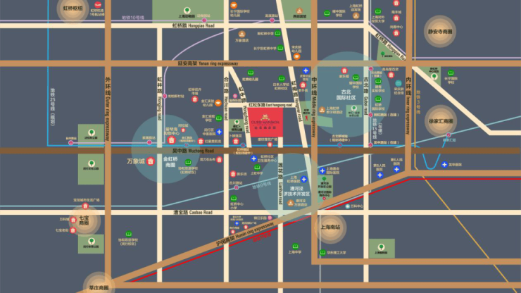 交通配套方面:项目地处长宁、徐汇、闵行三区交汇的金虹桥板块的核心区位,拥有多维立体的交通,延安高架、中环线、外环线环伺。