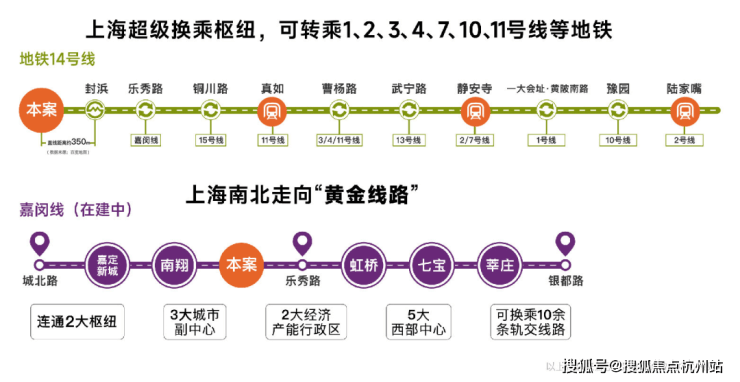 交通能级不断跃升:14号线和嘉闵线(在建中)双轨交汇,步行约200米14号线地铁口,14号线为高能级地铁线,5站普陀,30分钟直达静安,且始发有座,出行舒适;黄金走廊嘉闵线加速建设,约3站虹桥枢纽,未来可速达七宝、徐家汇、莘庄等核心区域。项目周边开泰路即将建成,绿野谷二期路段、骏达路、童家桥路、昌瑞路、涟澜路已启动建设,预计2026年建成。