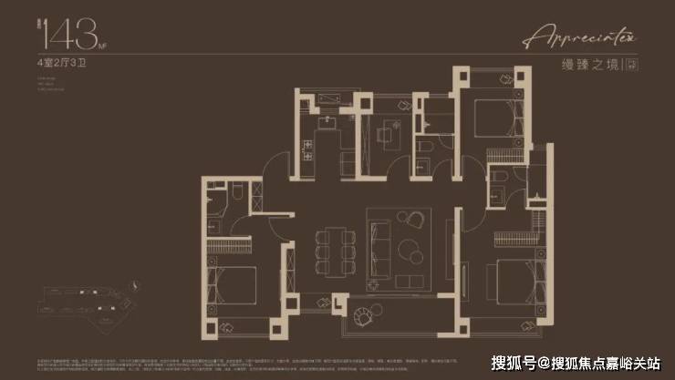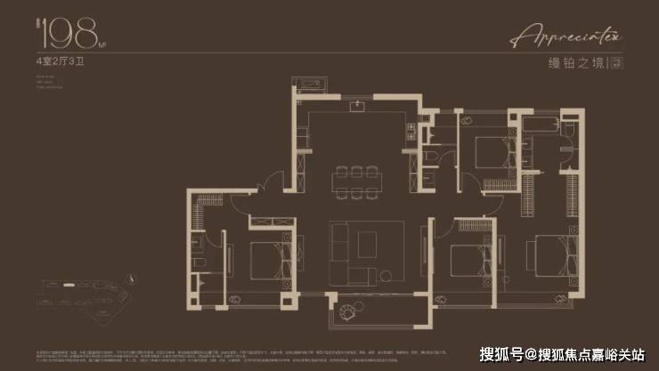 建面约143-198㎡四房三卫户型,2梯2户独立玄关设计,南向轩阔开间尺度(143户型约14米南向四开间,搭配约7米横厅;172户型约16米南向四开间,搭配约6米横厅;198户型约19米南向四开间,南北通厅设计,十字中轴洄游动线),揽四时风景入怀,东西双套房设计,奢阔尺度尽显家族气度,为高端改善和一步到位置业的优质选择。