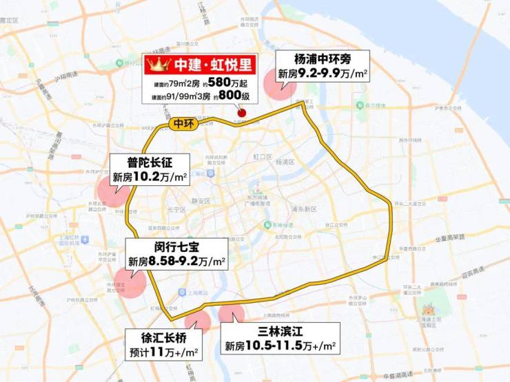 同环线普陀长征新房均价10.2万/㎡;闵行七宝也已8.58-9.2万/㎡。