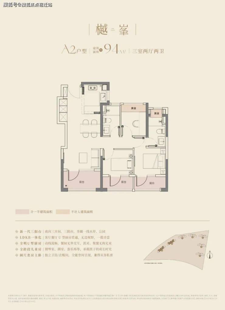 大华望樾建面约94㎡高层户型居然做到了三阳台的配置,远远超过新规标准。