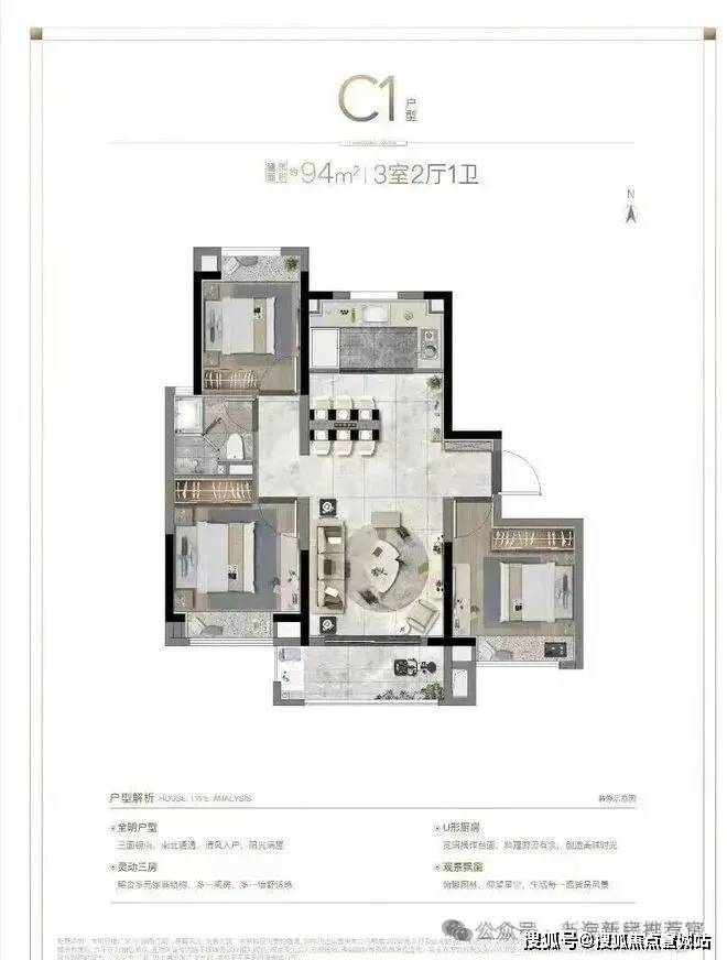 C3户型、建面约94㎡,三房二厅一卫