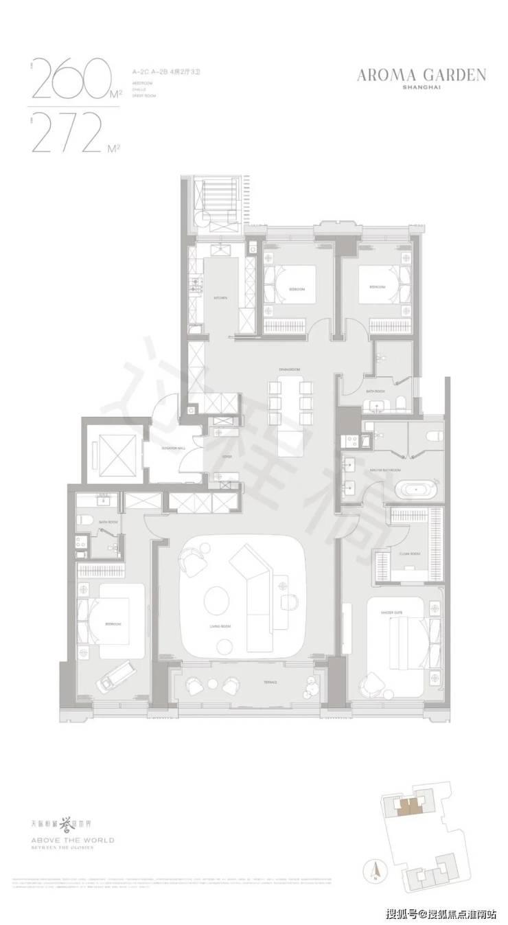 其中,A地块共计150套天际大平层,面积为建面约264-901㎡,主力户型为4房-5房。