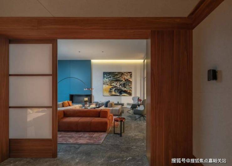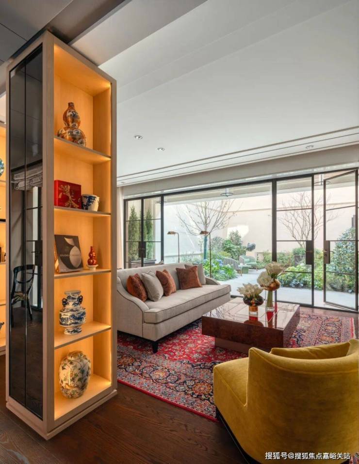 在客厅中,两个展示架巧妙地将空间分隔成主客厅区和休闲室,营造出一个与建筑尺度交相辉映的层次空间。