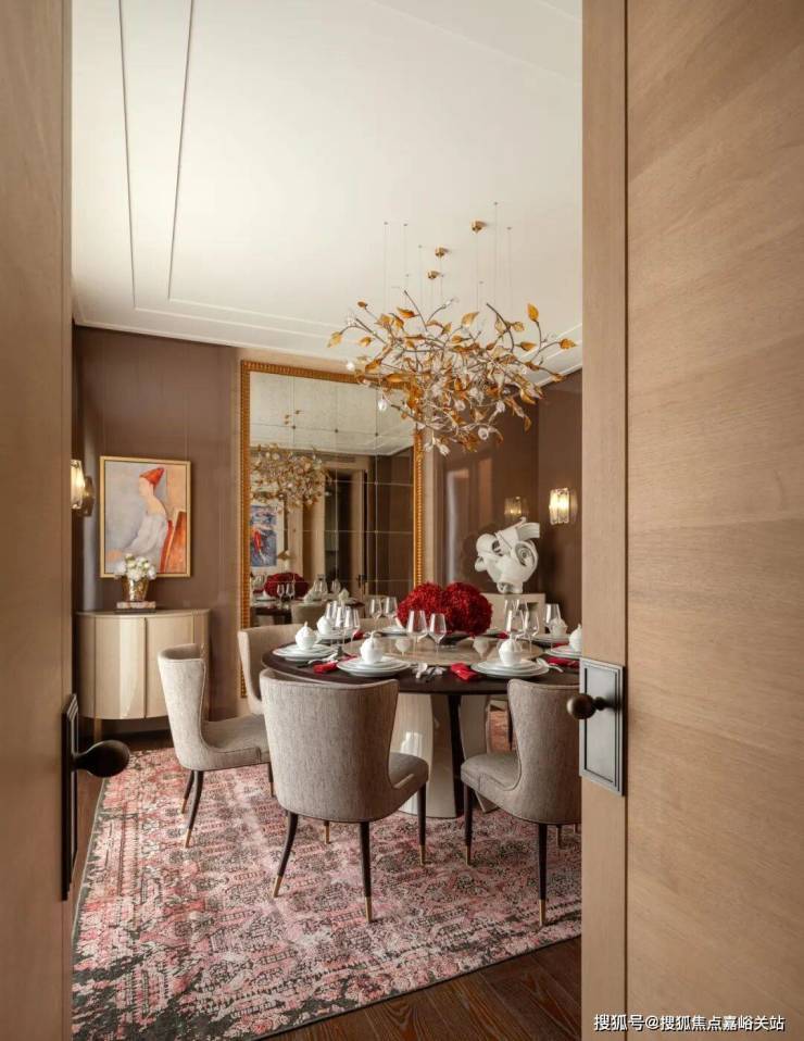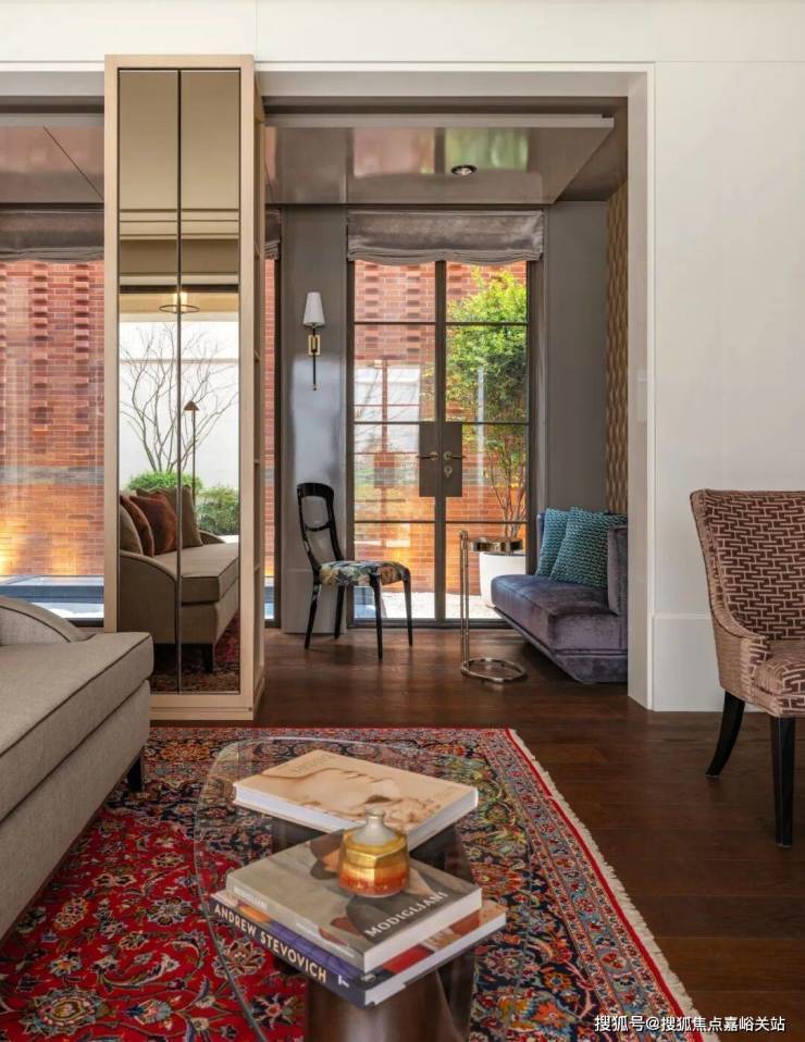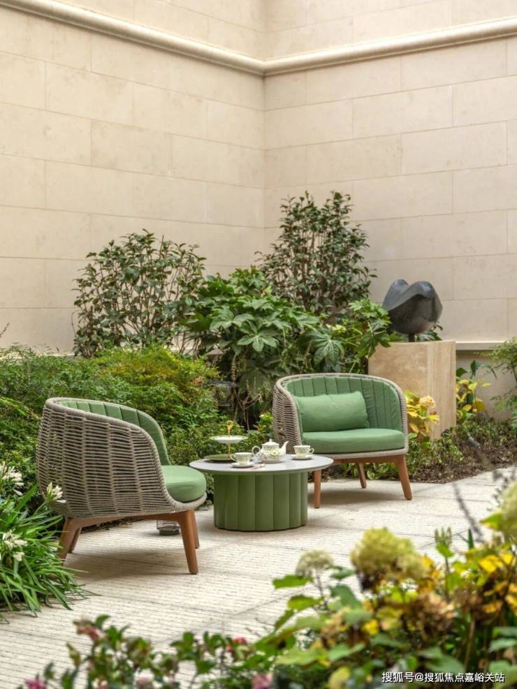 从庭院地面层,可以看到客厅和餐厅的内部空间。客厅在立面上向内凹陷,形成了一条有遮盖的走廊,通向房屋定制的深铜色入户大门。天潼198售楼处预约电话☎:400-8855-420📲✅