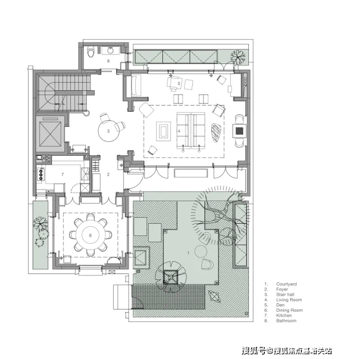 入户体验始于私家庭院。在高密度的城市环境中,庭院为住宅提供了一处解压之地,一缕新鲜空气。因此,在平面布局上,我们将所有重要空间布置在庭院周边,以充分利用庭院空间。
