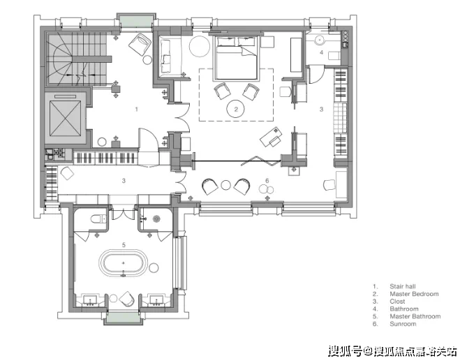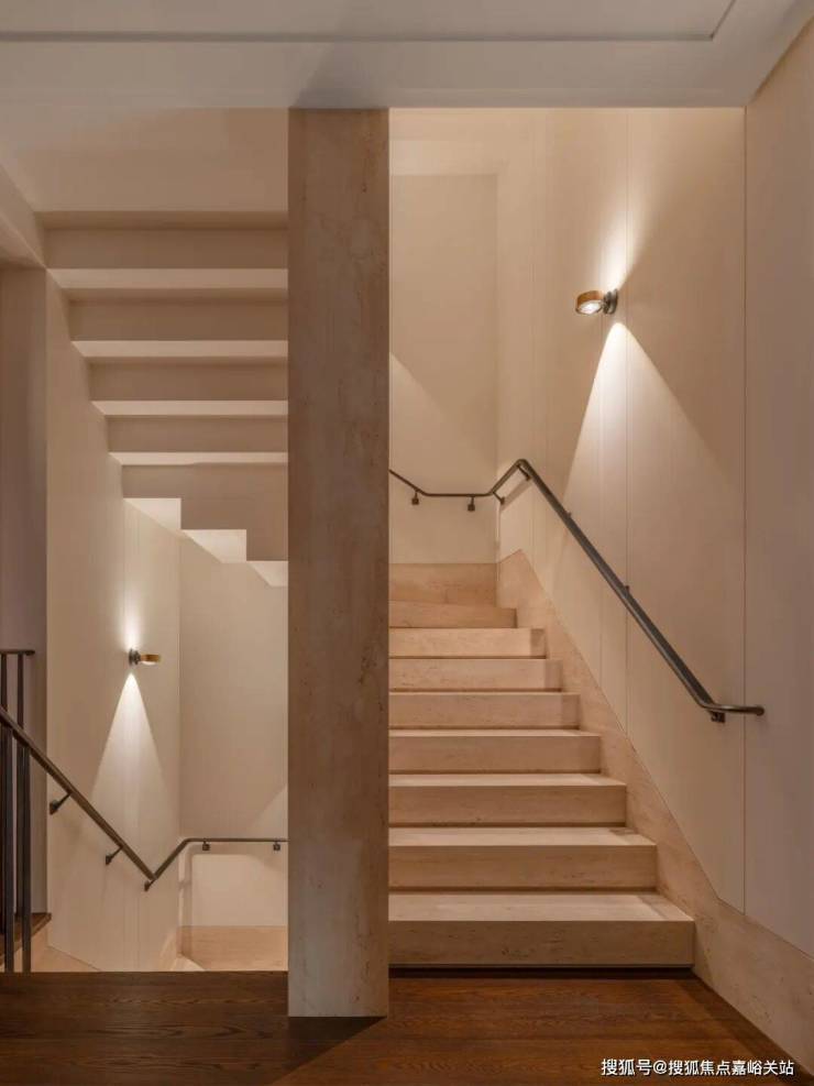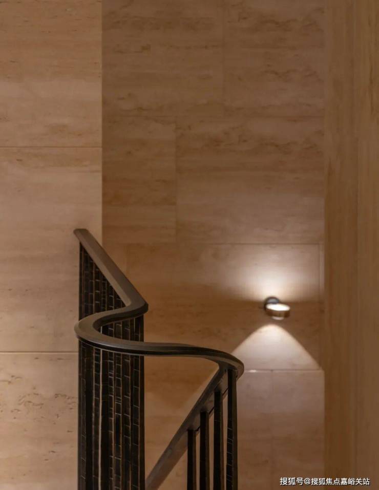 深铜色的栏杆和扶手融合传统与现代语汇,演变出一种当代型态,与现代白色洞石相映成趣,营造出优雅纯粹的意境。