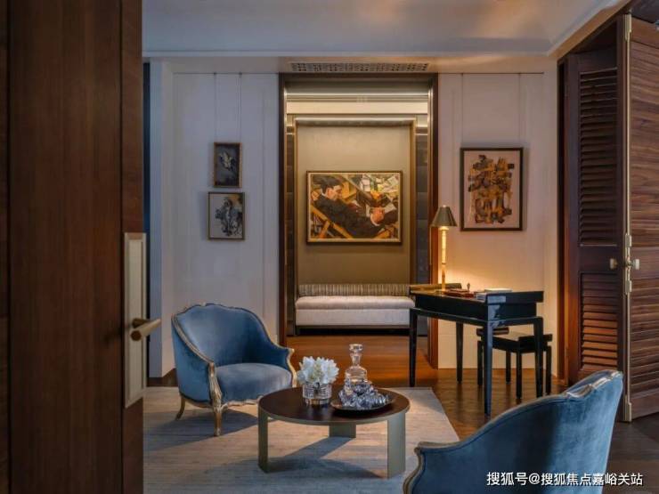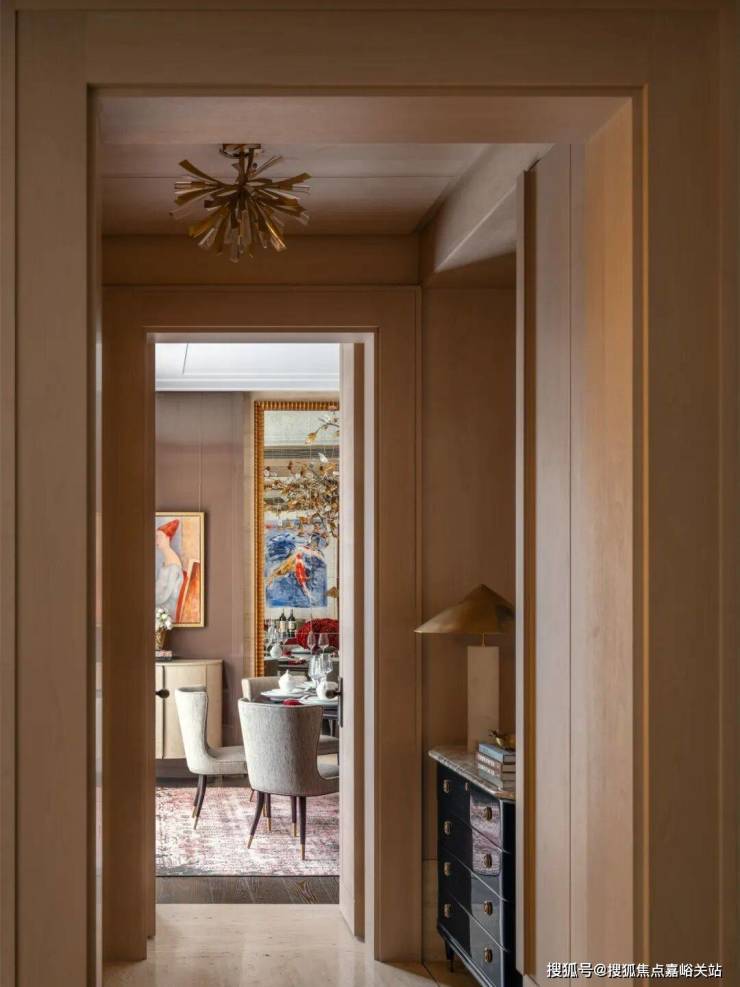 入户空间由一个简约的门厅和楼梯厅组成,门厅配有控制台和嵌入式衣柜。以多功能圆桌为中心的楼梯厅连接着楼梯、电梯、客用卫生间和客厅。空间采用白色洞石搭配特制染色的胡桃木,其浅色调与洞石和谐呼应,同时保留了胡桃木独特的纹理特征。天潼198售楼处预约电话☎:400-8855-420📲✅