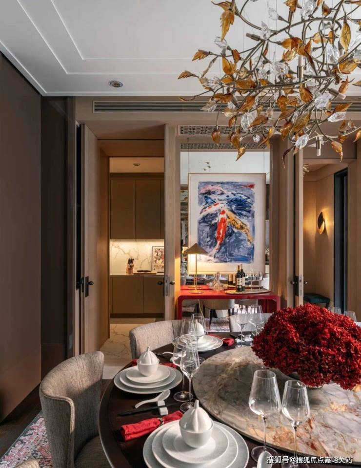 在'町屋'后方,是一个墙面和天花板都覆盖金箔的'金吧'。在这里,我们重新引入了一些当代西方设计语言——大理石地面图案、蛋形吧台和墙面护板细节。这些元素与醒目的红色高光烤漆柜相互平衡。天潼198售楼处预约电话☎:400-8855-420📲✅