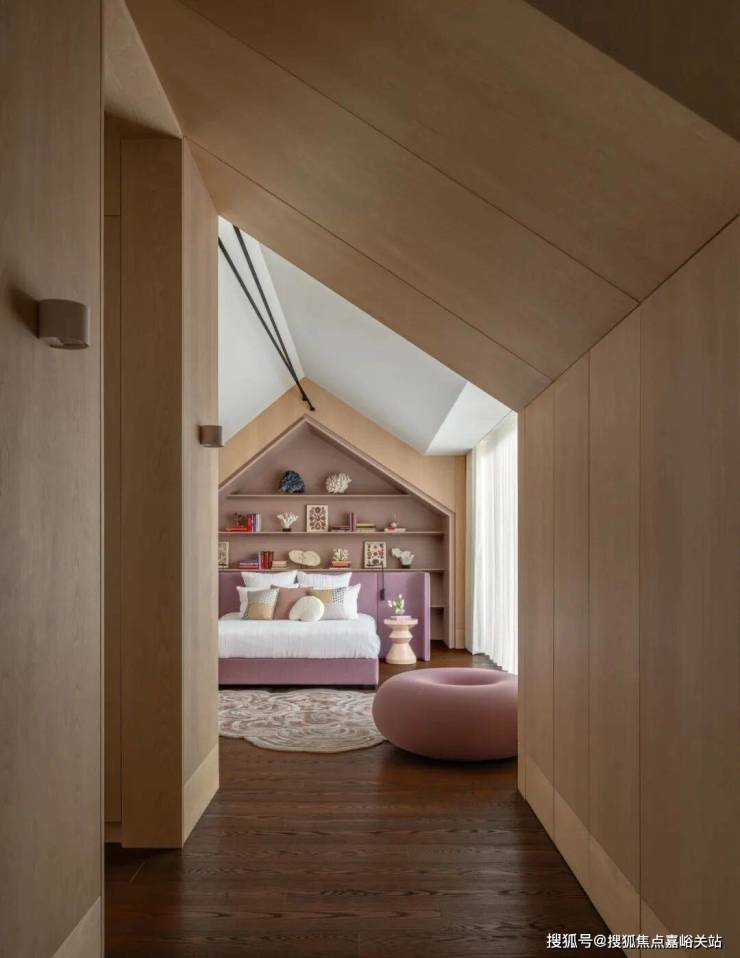 四层阁楼是大女儿的卧室。这里的斜顶启发我们在空间内打造了一个木质小屋;配备私人浴室和衣帽间,还有一个露天阳台,仿佛这充满阳光的一层就是个独立公寓。