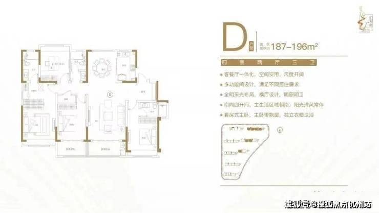 建面约187-196㎡四室两厅三卫户型特点:户型方正,南北通透,动静分区有序;双套房设计,卧室带飘窗,独立卫生间;客餐厅一体化,尺度开阔,全家共享;全明采光布局,告别暗房,明厨明卫;南向四开间,阳光清风常伴。