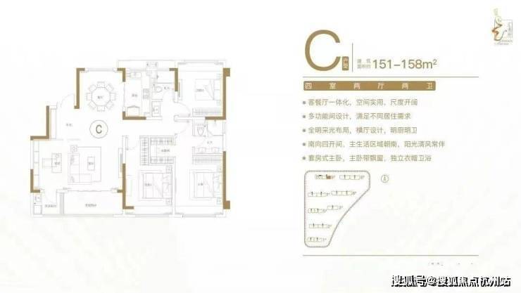 建面约151-158㎡四室两厅两卫户型特点:客餐厅一体化,空间实用,尺度开阔;多功能间设计,满足不同居住需求;全明采光布局,横厅设计,明厨明卫;南向四开间,主生活区域朝南,阳光清风常伴;套房式主卧,主卧带飘窗,独立衣帽卫。