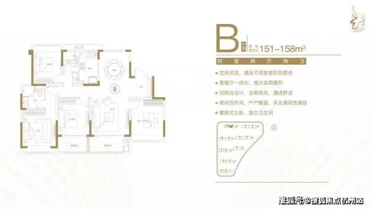 建面约151-158㎡四室两厅两卫户型特点:空间灵活,满足不同家庭阶段需求;客餐厅一体化,增大实用面积;双阳台设计,全明采光,通透舒适;南向四开间,户户飘窗,采光通风性俱佳;套房式主卧,独立卫生间。
