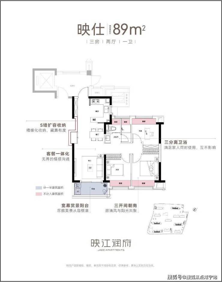 户型设计:主打89㎡及103㎡三房,均实现三开间朝南与客餐一体化布局。103㎡户型配备270°环幕飘窗,最大化引入江景与采光。