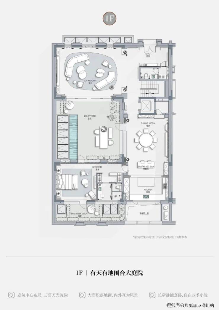 整个泳池天花板,呈现出海派拱形元素,落地玻璃窗外,是下沉式的景观空间: