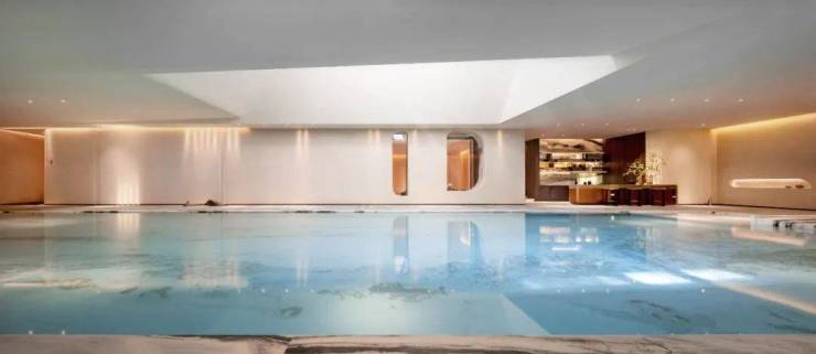 造型别致的罗马浴场风格和我国宋代名画《溪山行旅图》在这里完美碰撞,再加上项目很巧思的在泳池上方做了天窗,引进了自然光线,呈现出非常独特的美感。