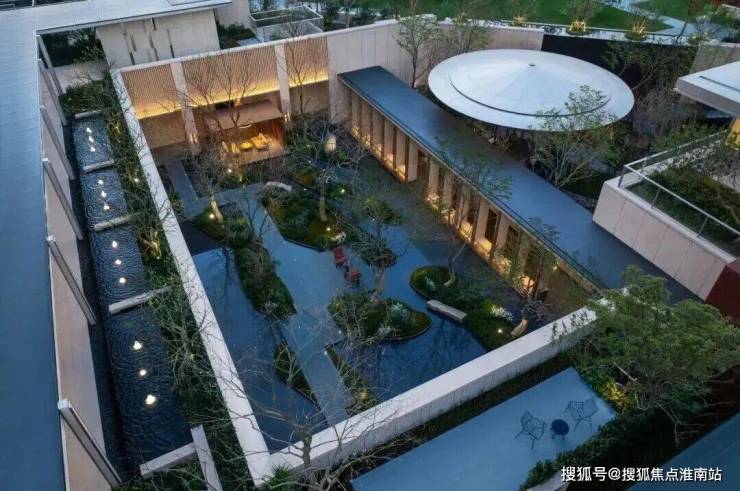 约6米高水幕的下沉式山水庭院,灵动的流水,层次丰富的空间,在自然松弛的氛围中,增添了一丝活泼的趣味。
