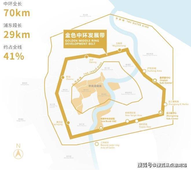 (金色中环发展带:浦东新区“十四五”时期生产力布局的重要 发展带之一,沿中环线推动重点板块联动发展。沿线串联前滩中央活动区、张江城市副中心、金桥城市副中心,张江集电港、御桥区域、 新杨思区域、三林环外区域和沪东区域等潜力地区,同时还包括多个 特色产业园区和3片楔形绿地。)