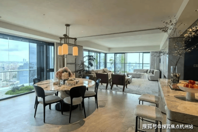 客厅以超大尺度惊艳亮相,若打通北向X空间,可拓展为约90㎡超级厅堂,家族宴请or高端社交,皆能轻松承载;约270°环幕视野将采光与观景效果推向极致,中高楼层可眺望陆家嘴三件套。