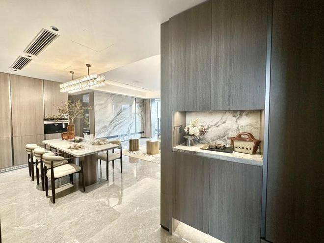客餐厅设计约9.8m超级收纳墙(非交付标准),收纳空间充足!✅✅中建山水雅境售楼处电话:400-8787-740 ✅✅冰箱置于“S”墙内,不占厨房空间,实现空间利用最大化。