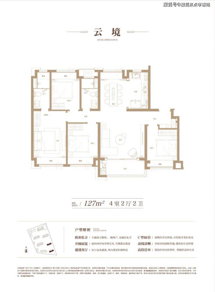 建面约127㎡4房的得房率约82%。
