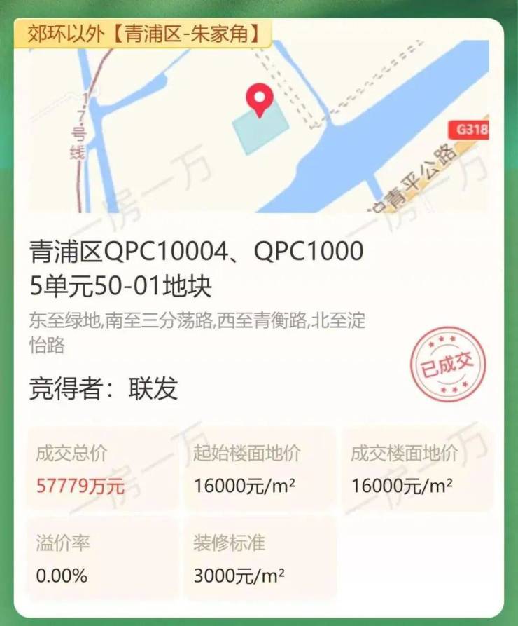 7月24日,第六批次土拍首日,联发以总价219480万元竞得青浦区QPC10004、QPC10005单元47-04、49-01、50-01地块,成交楼面板价14925元/㎡。