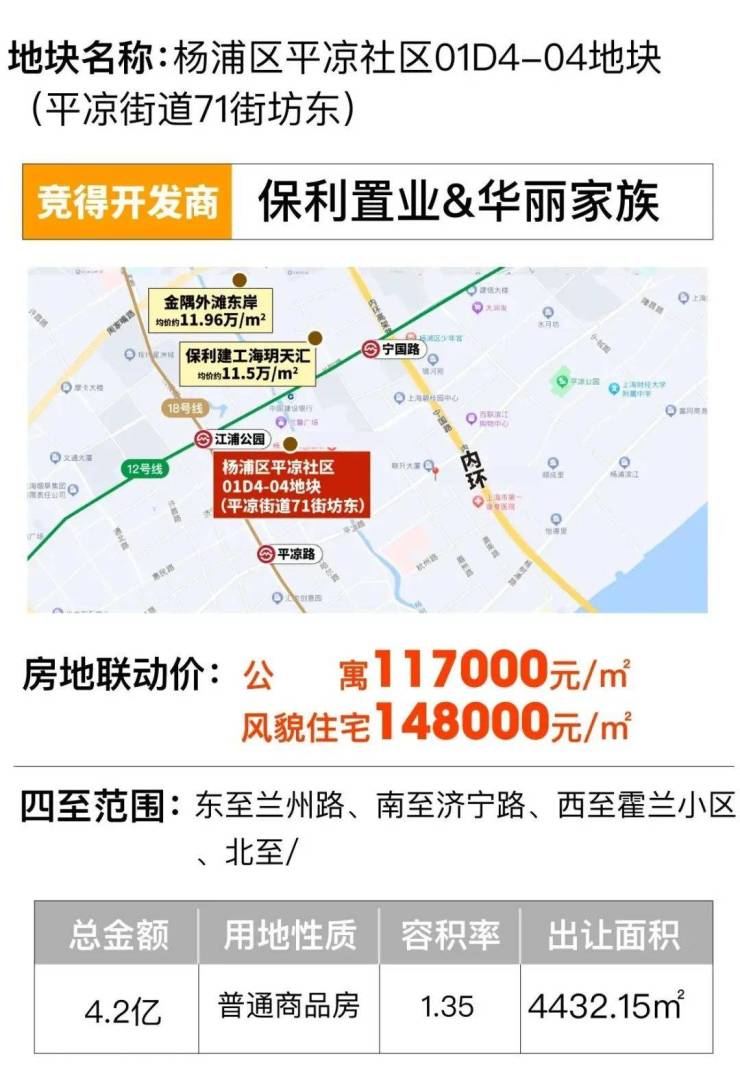 2023年12月,第四轮土拍中,华丽家族&保利以总价41885万元,拿下了杨浦区平凉社区01D4-04地块(平凉街道71街坊东),容积率1.35,溢价率0%,楼板价70002元/㎡,装修标准不低于40000元/㎡,房地联动价公寓117000元/㎡,风貌住宅148000元/㎡。