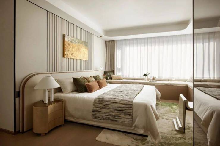 主卧套房设计,尺度惊人,贯穿南北,预留步入式衣帽间的空间,配备270°转角飘窗,实现无界视野和优异采光,大宅气度油然而生!