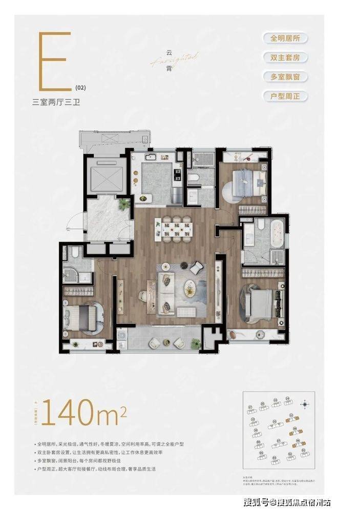 约98㎡3房2卫户型,三开间朝南,并且这贯穿客厅+次卧的超大阳台实在是惹眼,这个南向的视野延展度以及采光度相比同级别的户型来说,陆家嘴锦绣云澜售楼处电话☎:400-9966-940☎☎要更加出色。