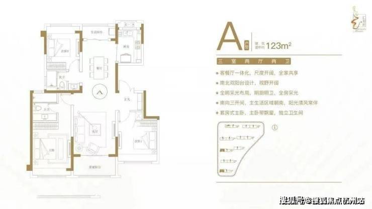 建面约123㎡三室两厅两卫户型特点:客餐厅一体化,尺度开阔,全家共享;南北双阳台设计,视野开阔;全明采光布局,明厨明卫,全房采光;南向三开间,主生活区域朝南,阳光清风常伴;套房式主卧,主卧带飘窗,独立卫生间。